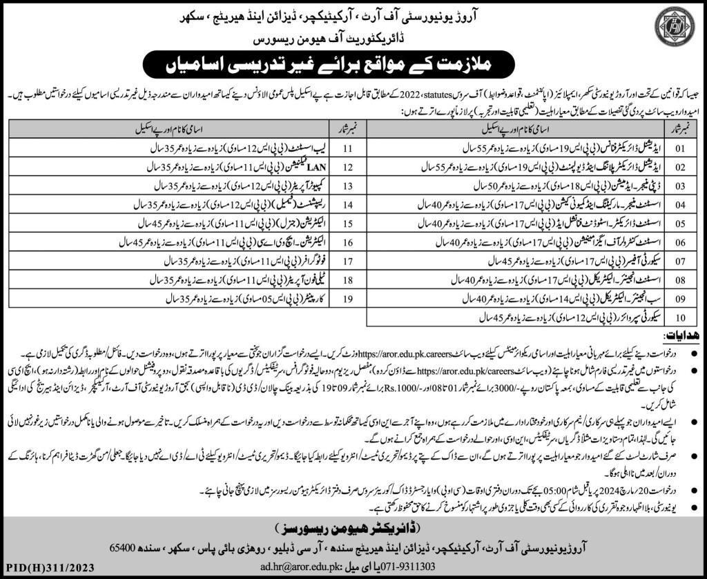 AROR University Sukkur Jobs 2024. AROR University Sukkur announced jobs for the vacant posts of Additional Director Finance, Additional Director Planning and Development, Deputy Manager Admission, Assistant Manager, Assistant Director, Assistant Controller of Examination, Security Officer, Assistant Engineer, Sub Engineer, Security Supervisor, Lab Assistant, LAN Technician, Computer Operator, Receptionist, Electrician, Photographer, Telephone Operator and Carpenter. Interested and eligible candidates can apply for the posts till March 20, 2024.
