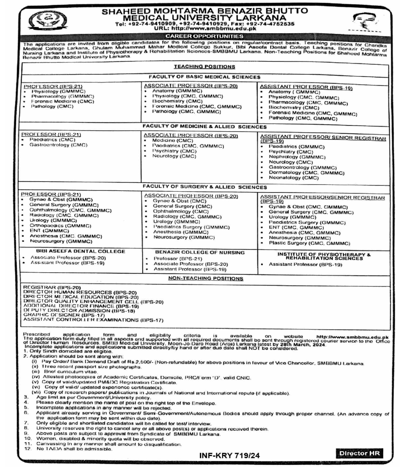 Jobs in SMBBMU Larkana March 2024. The applications are invited from eligible candidates for the positions of Professor, Associate Professor, Assistant Professor, Senior Registrar, Registrar, Director Human Resources, Director Medical Education, Director Quality Enhancement Cell, Additional Director Finance, Deputy Director Admission, Graphic Designer, Assistant Controller Examinations on regular/contract basis. Medical College Larkana, Ghulam Muhammad Mahar Medical College Sukkur Bibi Aseefa Dental College Larkana. Benazir College of Nursing Larkana and Institute of Physiotherapy & Rehabilitation Sciences-SMBBMU Larkana. Non-Teaching Positions for Shaheed Mohtarma Benazir Bhutto Medical University Larkana.