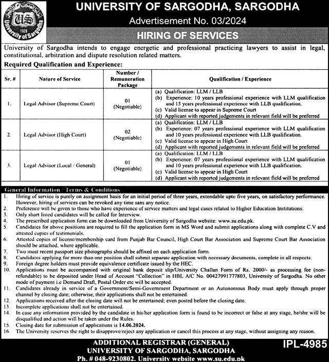 Jobs in University of Sargodha 2024 Apply Now. University of Sargodha intends to engage energetic and professional practicing lawyers to assist in legal, constitutional, arbitration and dispute resolution related matters. University invites applications to fill the posts of Legal Advisor Supreme Court, Legal Advisor High Court, Legal Advisor Local or General. Last date for applications submissions is June 14, 2024.