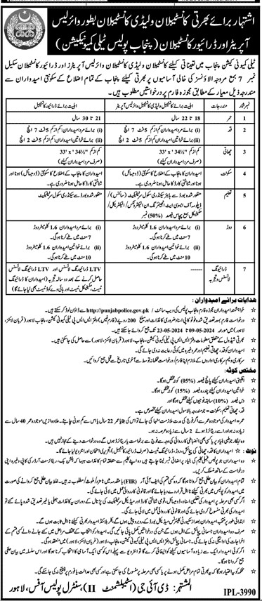 Jobs of Wireless Operators and Drivers Constables in Punjab Police 2024. Punjab Police invites applications from suitable candidates from both males and females for the posts of Wireless Operator Constable and Driver Constable. Applications form can be downloaded from Punjab Police Official Website. The last date for applications submission is May 23, 2024.