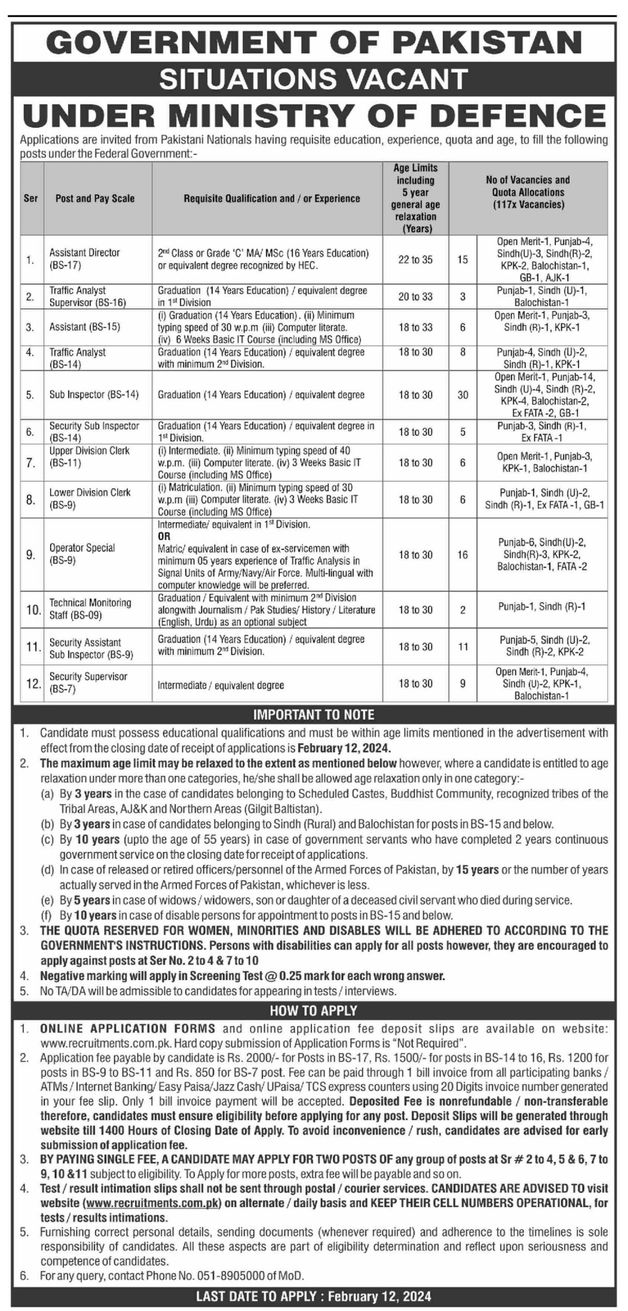 Ministry of Defence announced various jobs for which Applications are invited from Pakistani Nationals having requisite education, experience, quota and age, to fill the following posts under the Federal Government: